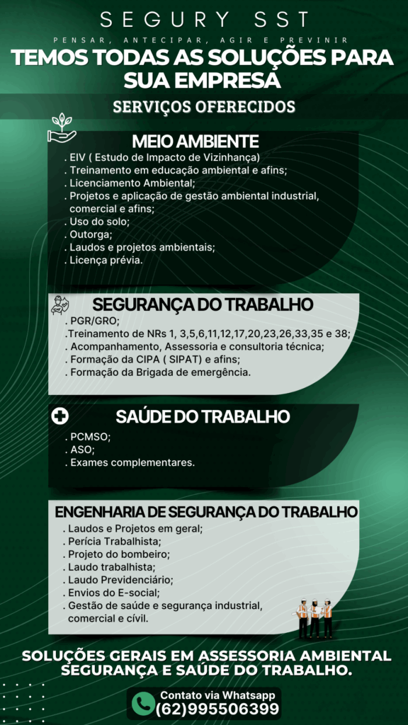 A SEGURY SST é uma empresa especializada em Segurança do Trabalho e Meio Ambiente, dedicada a proteger vidas, prevenir riscos e garantir conformidade legal para empresas de todos os portes. Com uma equipe técnica qualificada e soluções personalizadas, oferecemos consultorias, treinamentos e laudos que fortalecem a cultura de prevenção e sustentabilidade no ambiente corporativo.